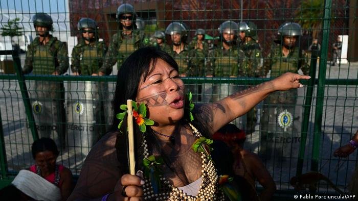 “As empresas estão entrando nas nossas terras. Estão transformando tudo em mercadoria, a floresta, os rios, o crédito de carbono”, disse Alessandra Munduruku durante a manifestação.