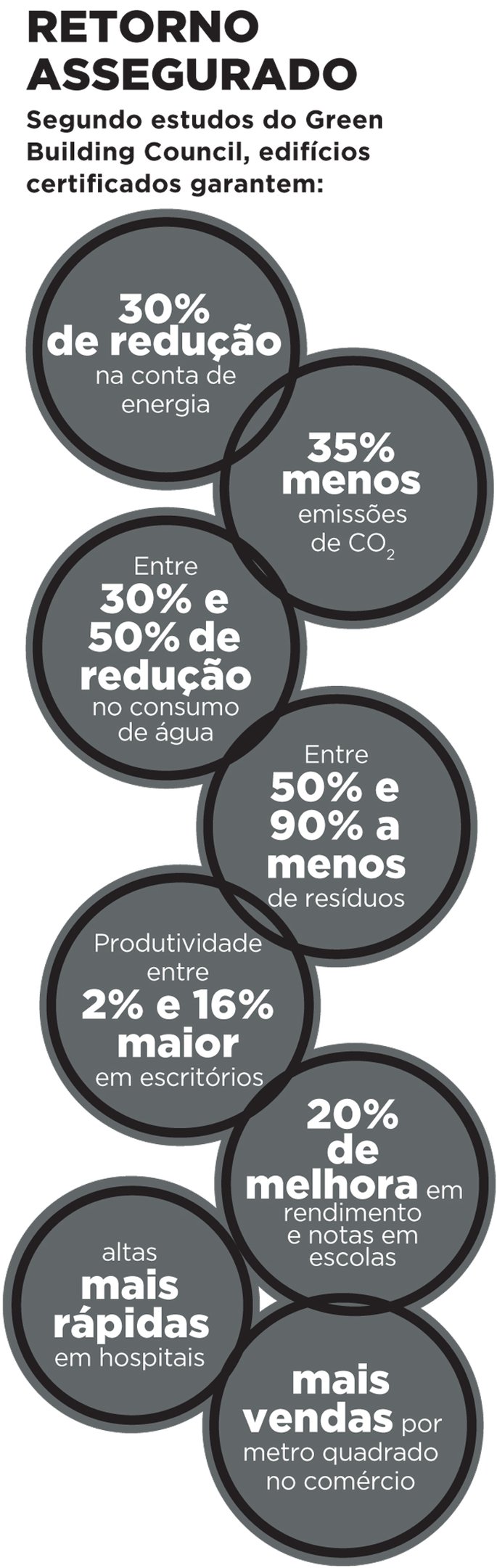 Levantamentos internacionais da ONG indicam que edifícios certificados garantem: uma produtividade entre 2% e 16% maior em escritórios; 20% mais rendimento e melhores notas em escolas; altas mais rápidas em hospitais; e mais vendas por metro quadrado no comércio. Isso porque aspectos como ventilação, temperatura interna, distribuição dos espaços, vista para fora, ergonomia dos ambientes e materiais utilizados afetam a saúde das pessoas e influem nas sensações que os espaços produzem nelas. Quando essas questões são mal resolvidas, o ambiente pode causar doenças físicas e mentais em seus ocupantes.