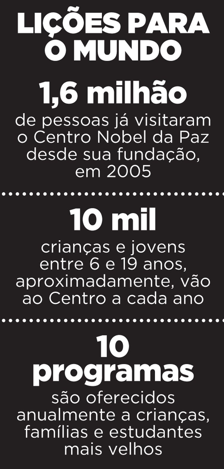 O prédio do Centro Nobel da Paz, em Oslo, capital da Noruega (Foto: Divulgação)Uma equipe de quatro educadores treinados administra dez programas por ano, concebidos para crianças, famílias e estudantes mais velhos. Qualquer escola ou pessoa pode se inscrever nas sessões de treinamento de uma hora e em outras atividades, incluindo palestras e filmes, que abrangem tópicos no cerne da história do Prêmio Nobel da Paz, como resolução de conflitos e direitos humanos. Nossa primeira tarefa com as crianças é explorar o conceito de paz. Todos sabem que querem paz, mas não é tão fácil falar ou ensinar. Quando começamos a defini-la, a maioria dos alunos diz que a paz é a ausência de guerra. Isso é suficiente? Desafiamos os estudantes a pensar mais. A paz pode ser algo mais do que a ausência de guerra e, em caso afirmativo, o que é isso? E o que destrói a paz?
