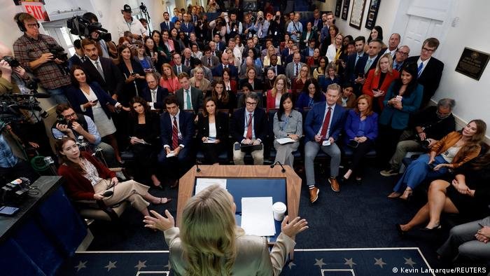 “As fake news que vemos sendo despejadas deste prédio diariamente… é sinceramente esmagador tentar acompanhar tudo isso,” disse, na semana passada, a secretária de imprensa da Casa Branca, Karoline Leavitt, durante uma coletiva com os correspondentes que cobrem a Presidência.