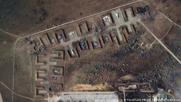 A base, na costa sudoeste da Crimeia, sofreu graves danos causados por fogo. Carcaças queimadas de pelo menos oito aviões de guerra podem ser vistas claramente nas imagens.