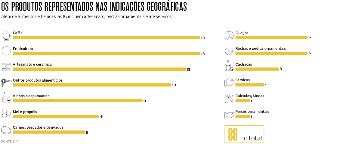 Desde então, o conceito de indicação geográfica foi aplicado para outros produtos, como cafés, queijos, cachaças, mel, frutas, pescados, carnes, além de vinhos. Rochas e pedras ornamentais também podem ser contempladas com indicações geográficas. Três das quatro IG do Rio Janeiro dizem respeito a pedras ornamentais (a outra engloba a cachaça de Paraty). “A legislação brasileira permite até o registro de IG nas áreas de artesanato e de serviços”, destaca a professora de direito econômico e do trabalho Kelly Bruch, da Universidade Federal do Rio Grande do Sul (UFRGS), estudiosa do marco legal das IG brasileiras. Recentemente, a França também passou a reconhecer IG para o setor de artesanato. As normativas brasileiras que regem a criação de uma indicação geográfica no país são inspiradas pela legislação europeia, que valoriza produtos agropecuários fabricados em áreas delimitadas, geralmente com ingredientes ou práticas tipicamente locais ou específicas (ver box).