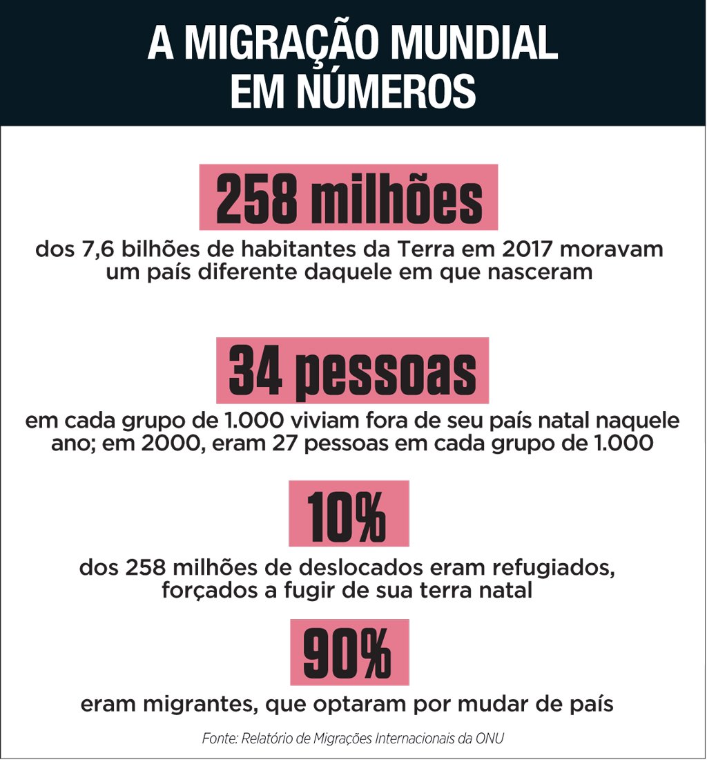 Seja por curiosidade, por desejo de crescimento pessoal e econômico ou por reais necessidades de sobrevivência, o ser humano se desloca pelo planeta desde o início da sua existência e nunca deixará de fazê-lo. Em 2017, de uma população mundial estimada em 7,6 bilhões de habitantes, 258 milhões de pessoas moram em um país diferente do qual nasceram, de acordo com o Relatório de Migrações Internacionais da ONU. Isso quer dizer que de cada 100 seres humanos, pelo menos três (mais exatamente, 3,4) vivem fora da sua terra natal – em 2000, essa taxa era de 2,7.