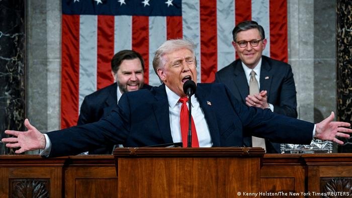 Republicano diz que gerou um boom econômico no país e impôs uma nova ordem no exterior. Veja os destaque de uma fala que visa conter queda nos índices de aprovação do governo a poucos meses de eleição.O presidente dos Estados Unidos, Donald Trump, fez nesta terça‑feira (25/02), em uma sessão conjunta do Congresso, seu discurso anual sobre o Estado da União, destacando o aumento da produção econômica, a redução nos números da imigração e a equipe masculina de hóquei no gelo dos EUA.