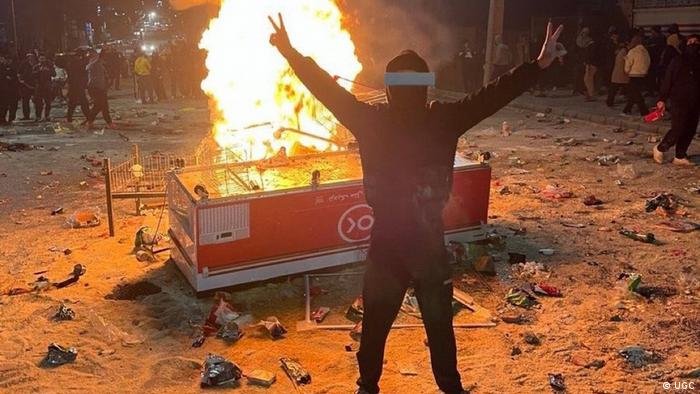 Em imagens da cidade de Mashhad, no nordeste do país, é possível ver fumaça subindo ao céu noturno vinda de incêndios na rua, manifestantes mascarados e uma rua coberta de destroços, como mostra outro vídeo postado no sábado. Explosões podiam ser ouvidas.