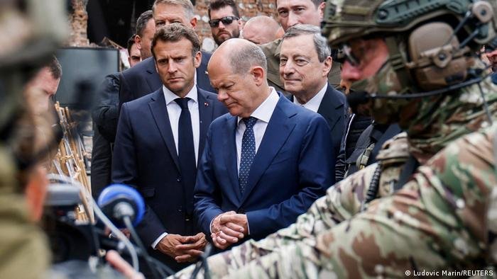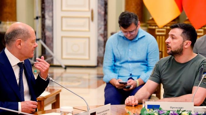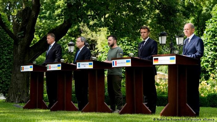 O chanceler alemão, Olaf Scholz, o presidente francês, Emmanuel Macron, o primeiro-ministro italiano, Mario Draghi, e o presidente romeno, Klaus Iohannis, reuniram-se em Kiev com presidente ucraniano, Volodimir Zelenski.O chanceler federal alemão, Olaf Scholz,...