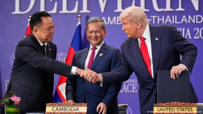 Presidente americano pressionou por acordo por meio de medidas comerciais. Termos incluem devolução de prisioneiros e retirada de minas terrestres da fronteira.Tailândia e Camboja assinaram neste domingo (26/10) um acordo ampliado de cessar-fogo, suspendendo uma disputa secular pelo Triângulo de Esmeralda – área onde a fronteira dos dois países se encontra com a do Laos.