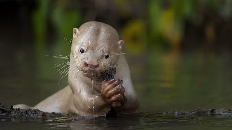 Uma lontra rara de coloração clara se alimenta de um peixe em um rio do Pantanal, no Mato Grosso do Sul.